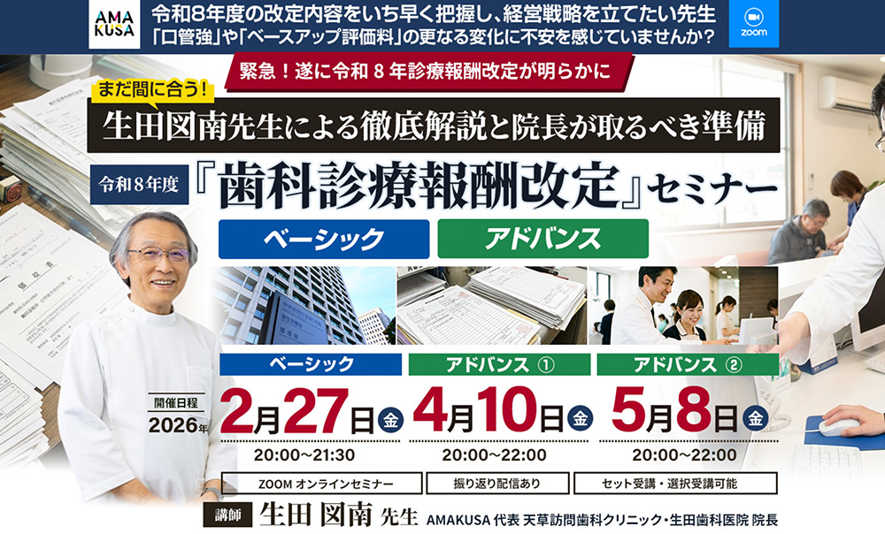 AMAKUSA会員とは、毎月第4月曜日に開催される、生田図南先生を初め、生田歯科医院スタッフによる「最先端・歯科知識」をオンラインで学習と仕組み導入フォロー付きで、日本の歯科の10年後、生田歯科医院の歯科経営戦略の極秘内容を会員だけが聞ける限定会員グループです。